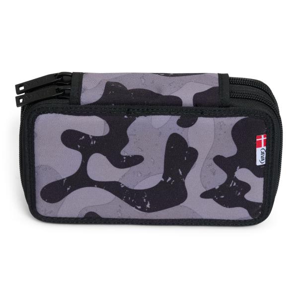 JEVA penalhus med ergonomiske skriveredskaber, to lynlåse og sejt sort og gråt camouflagemønster. Kanterne og de stærke lynlåse er sorte.