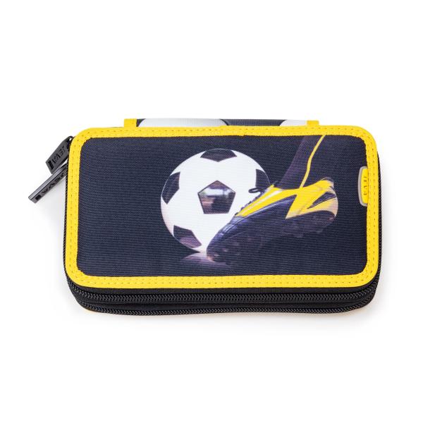 JEVA penalhus med fodbold og ergonomiske skriveredskaber, to lynlåse og flot fodboldmotiv på sort baggrund. Kanterne er i pang-gul, og de stærke lynlåse er sorte.