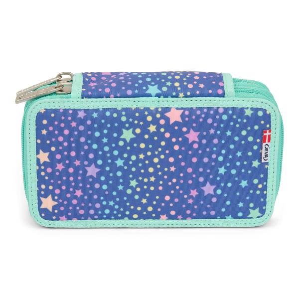 JEVA penalhus med ergonomiske skriveredskaber, to lynlåse og med et fint fuldprintet stjernemønster. Kanterne og de stærke lynlåse er grønne.