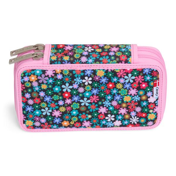 JEVA penalhus med ergonomiske skriveredskaber, to lynlåse og flot blomstret mønster i smukke farver. Kanterne og de stærke lynlåse er pink og giver en fin kontrast til penalhuset.
